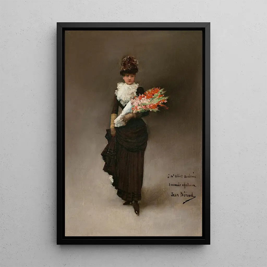 In the art print of "Young Woman with a Bouquet of Flowers," Jean Béraud immerses us in a world of delicacy and freshness. The canvas depicts a radiant young woman holding a vibrant bouquet of flowers that contrast with her elegant attire. The bright colors and meticulous details of the flowers create a joyful and lively atmosphere. Light plays a crucial role in this artwork, illuminating the young woman's face and highlighting the beauty of the petals. Béraud's technique, marked by finesse, reveals his talent for capturing the ephemeral beauty of nature.