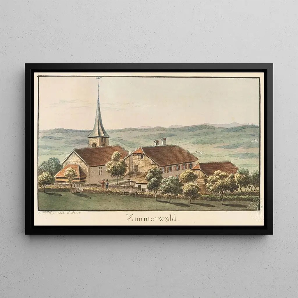 The art print Zimmerwald by Jakob Samuel Weibel transports us to the heart of a mountainous landscape imbued with tranquility. The soft shades of greens and blues blend harmoniously, evoking the freshness of Swiss alpine pastures. The watercolor technique, mastered by the artist, gives this piece a light and airy atmosphere, where each brushstroke seems to capture the light of a summer day. The delicate details of the trees and mountains invite peaceful contemplation, making this canvas a true visual refuge.